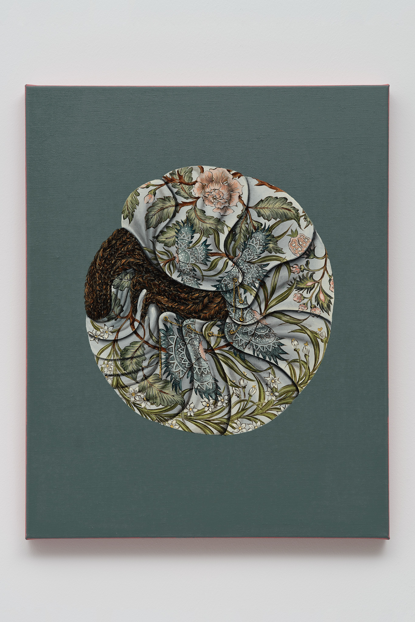As source material, Mona Ardeleanu employs fragments of patterns, textiles, colours, and shapes that she first sketches and then finishes through an organic, additive process of painting. This expands the initial drawings into an image of ever-greater complexity and detail, which hover over their, at first glance, monochrome backgrounds. However all her backgrounds are built in many thin layers, creating a special aura for each of her pieces by using a similar colour pallett for every series.