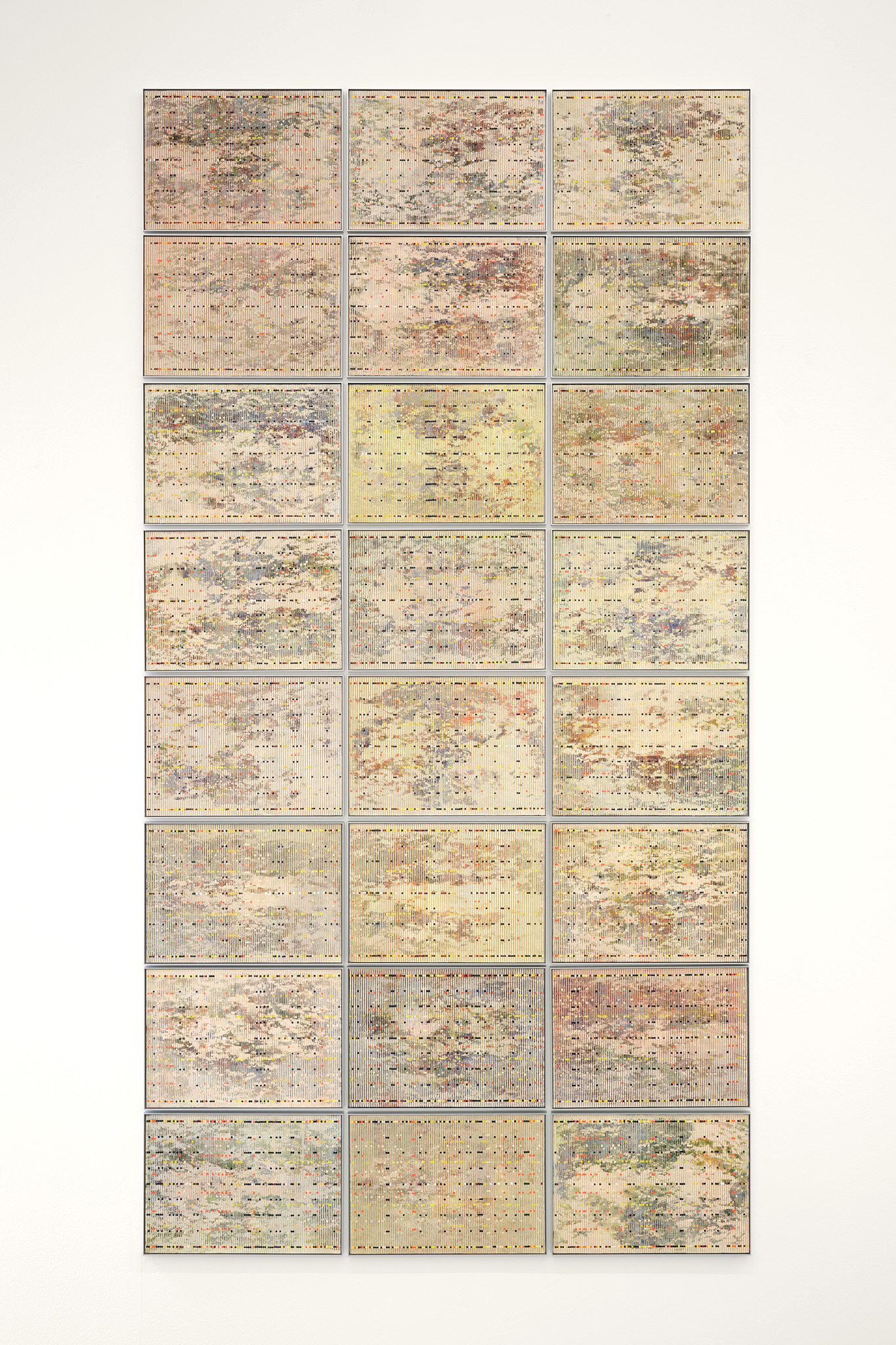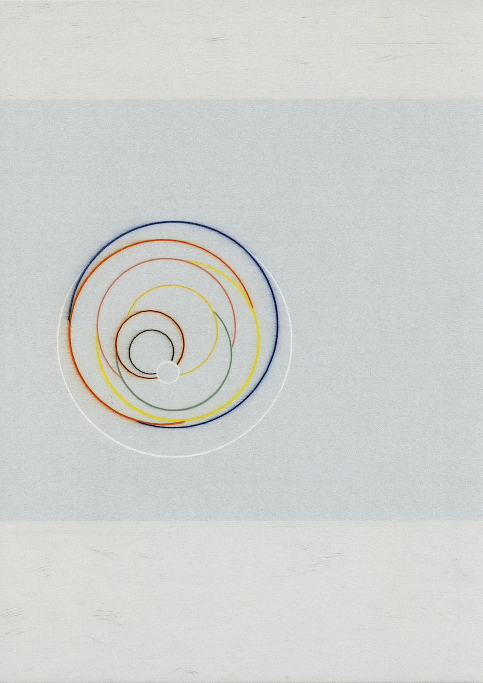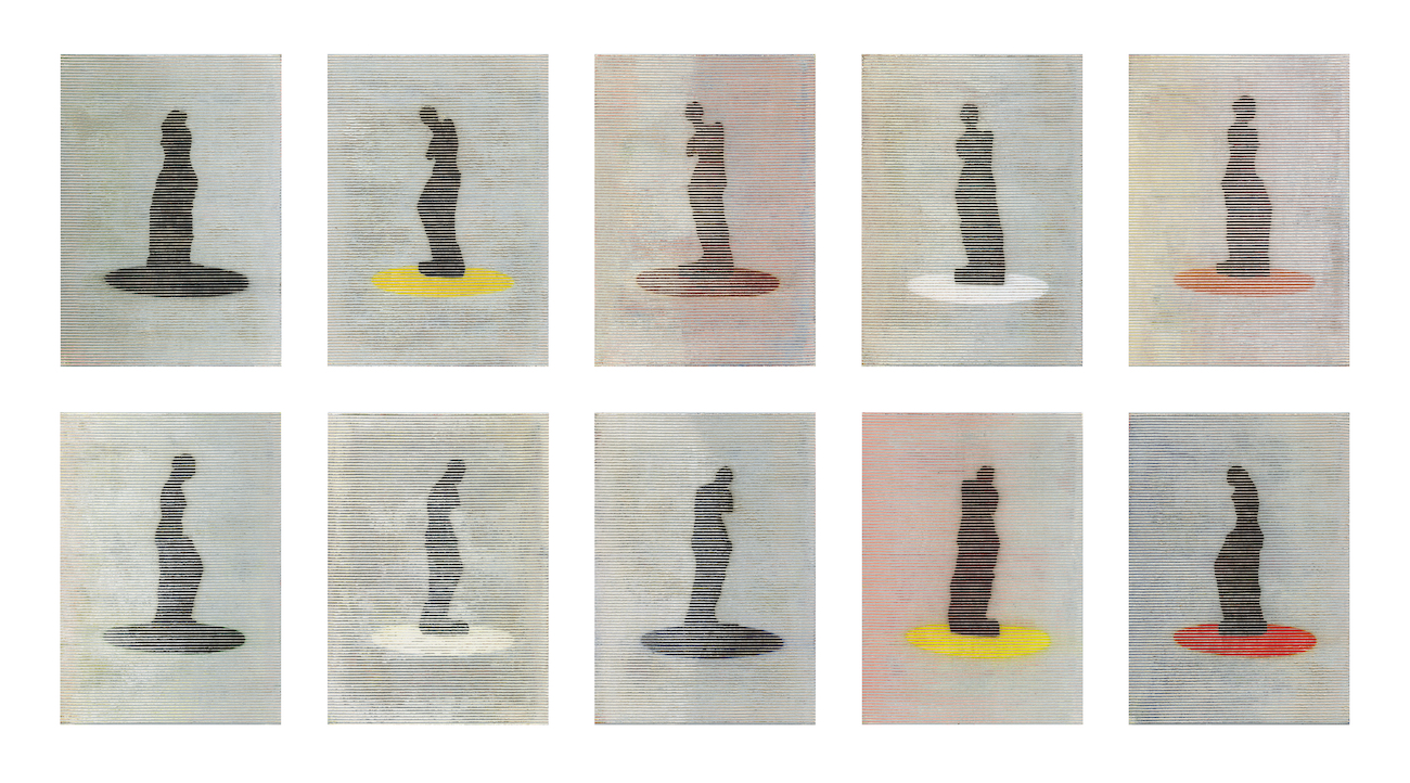 JDW: Maniera was originally going to be called ‘Renaissance’, but the term ‘Maniera’ also includes ‘style’ and ‘mannerism’, which has an ironic ring to it. Maniera suits this juncture better. The Venus de Milo may have preferred to remain undiscovered under the earth, but now that it’s here and I’ve seen it in the Louvre, it’s become history. I cannot help but associate it with myself. I have a scale model of it in my studio. In other words, I cannot help but translate it. This happens associatively, at lightning speed. I think of Hodet, a work by Markus Raetz on the island of Vestvågøy, then the midnight sun, Pi and finally, a circle. This is how the ingredients for the 10-piece work come together. It’s not like I sat down and decided to make Venus spin like a doll in an entertainment world on top of a coloured circle behind a screen of ten coloured lines. But I did keep in mind that the silhouette seems to look at us and then averts our gaze. Ten times we see a different form, at once abstract and amorphously figurative, balancing perception and thought, spinning endlessly. And the ravages of time, well, in my opinion, there’s nothing more beautiful than the deterioration of a fresco. I can think of no more poignant metaphor.