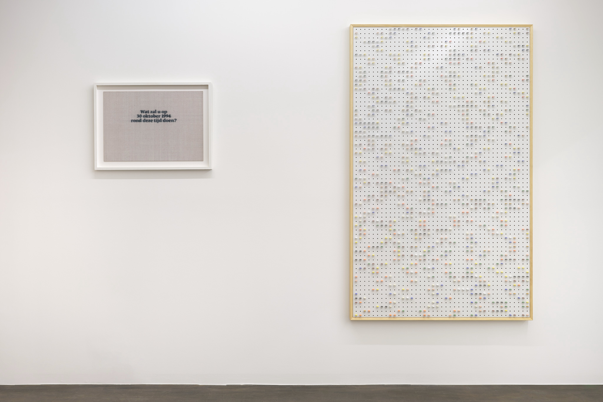 How could humans have organised their sojourn differently? Without Peloponnesian, civil and world wars? Without all-consuming, runaway capitalism? In that case, magnificent works of art might never have been created. We are perpetually at a fork in the road, forced to choose a direction. A translation of this could be Pi of De val der engelen. Every perspective is present, but without a trace – up is down and left is right. Do you look at a map of the world? At clouds? At a plan with coloured satellites in battle formation? At a tapestry? It dizzies like in Frits Van Den Berghe’s beautiful, swirling and almost violent De val der heiligen (Museum of Fine Arts Ghent), which, incidentally, was more or less the model for my Pi of De val der engelen. Ironically, Pi offers some structure. It’s legible, with a colour for each decimal, and the first part, with 24 pieces, is exactly the same height as its creator.